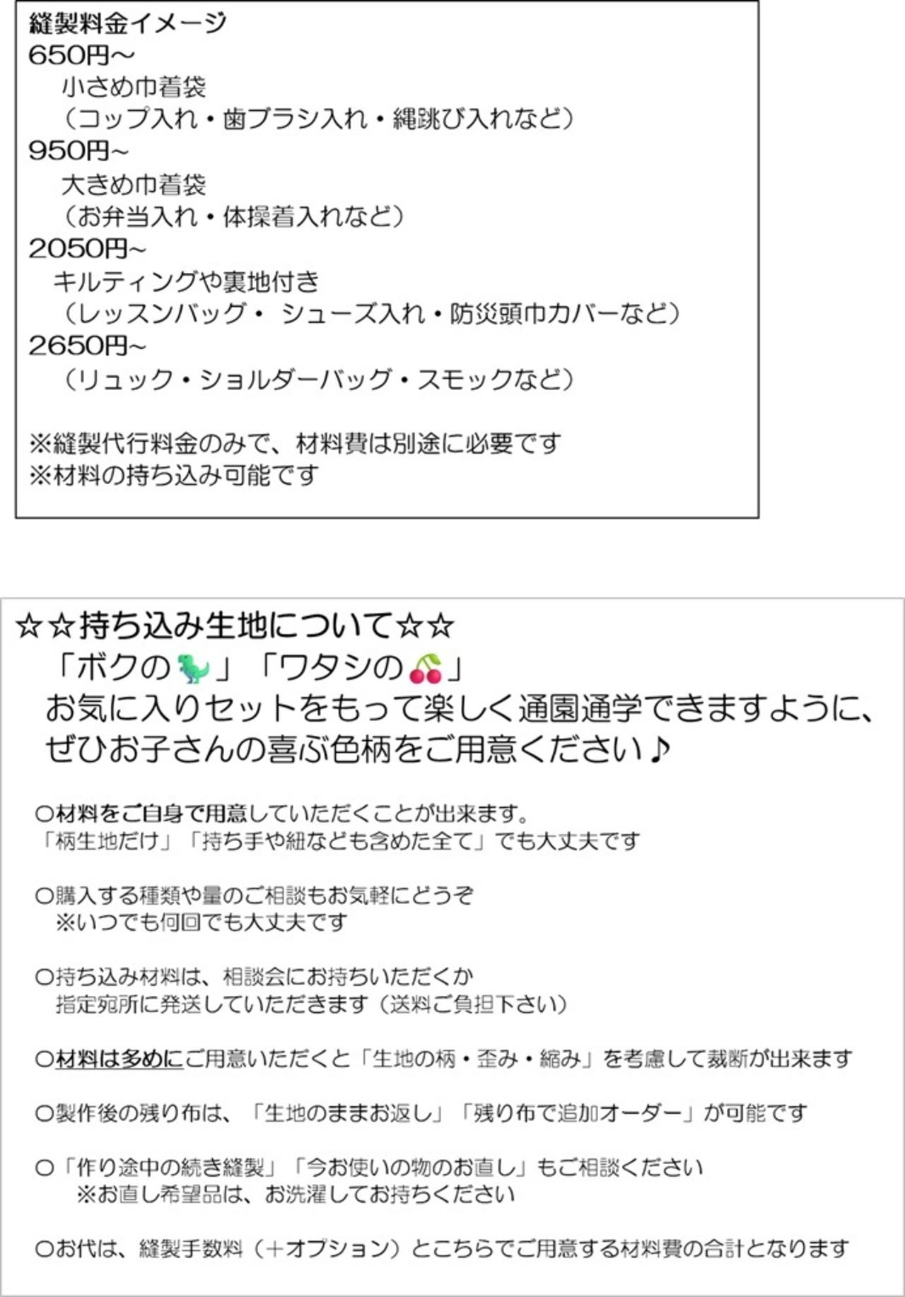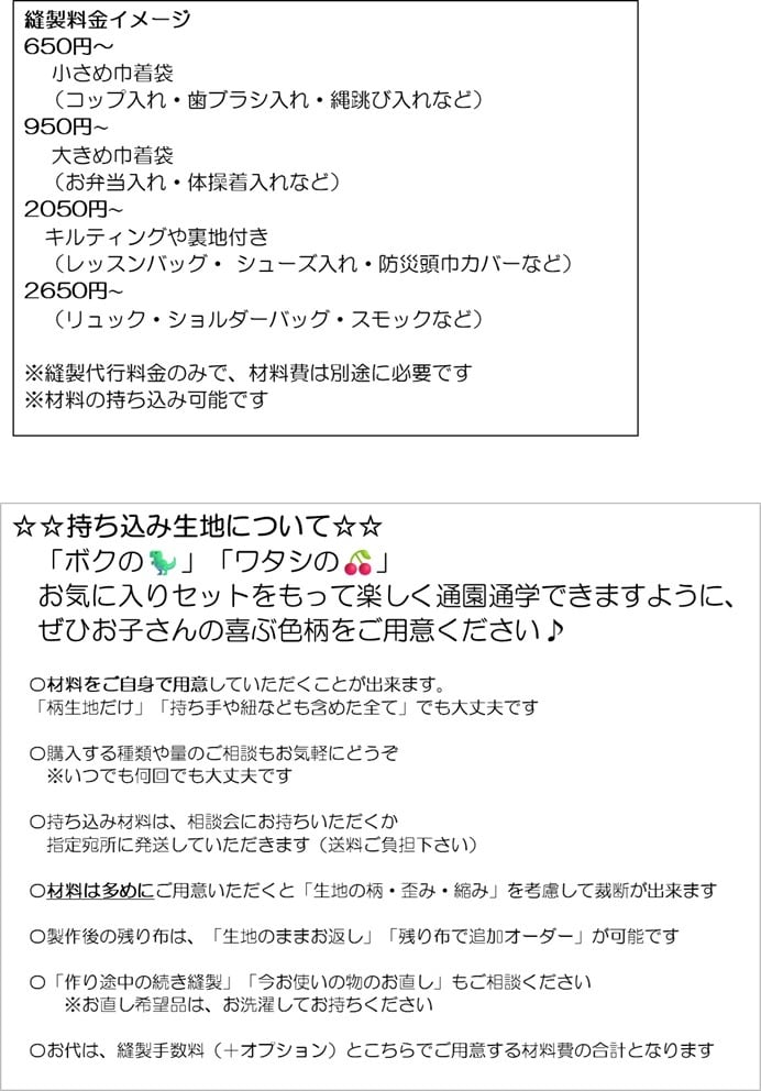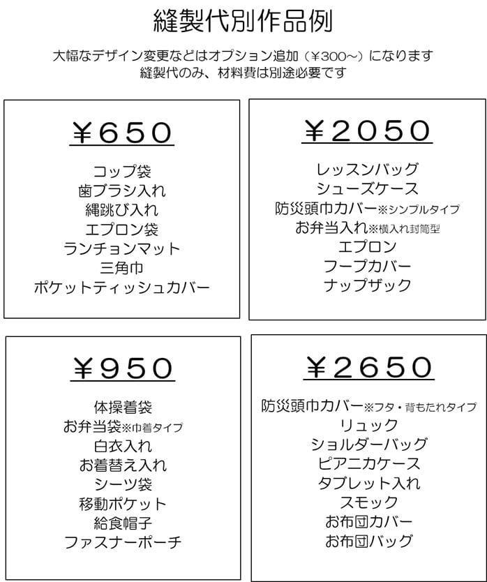 〇お代は、縫製手数料(+オプション)とこちらでご用意する材料費の合計となります