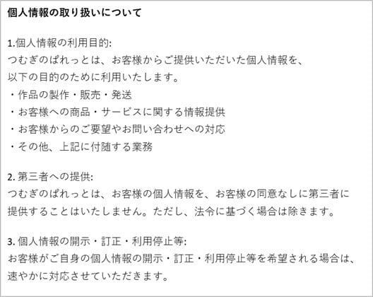 つむぎのぱれっとは、お客様からご提供いただいた個人情報を、